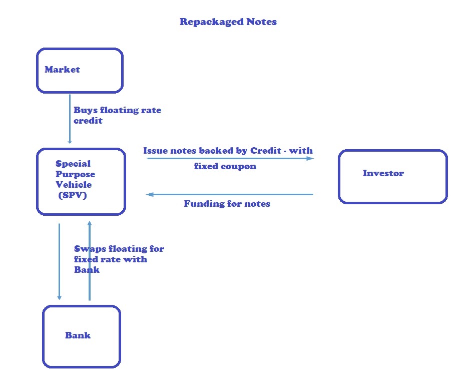 Repackaging involves placing securities and derivatives in a Special Purpose Vehicle (SPV) which then issues customized notes that are backed by the instruments placed. The difference between repackaged notes and CLDs (Credit Linked Deposits) is that while CLDs are default swaps embedded in deposits/notes, repackaged notes are issued against collateral – which typically would include cash collateral (bonds / loans / cash) and derivative contracts. Another feature of Repackaged Notes is that any issue by the SPV has recourse only to the collateral of that issue.